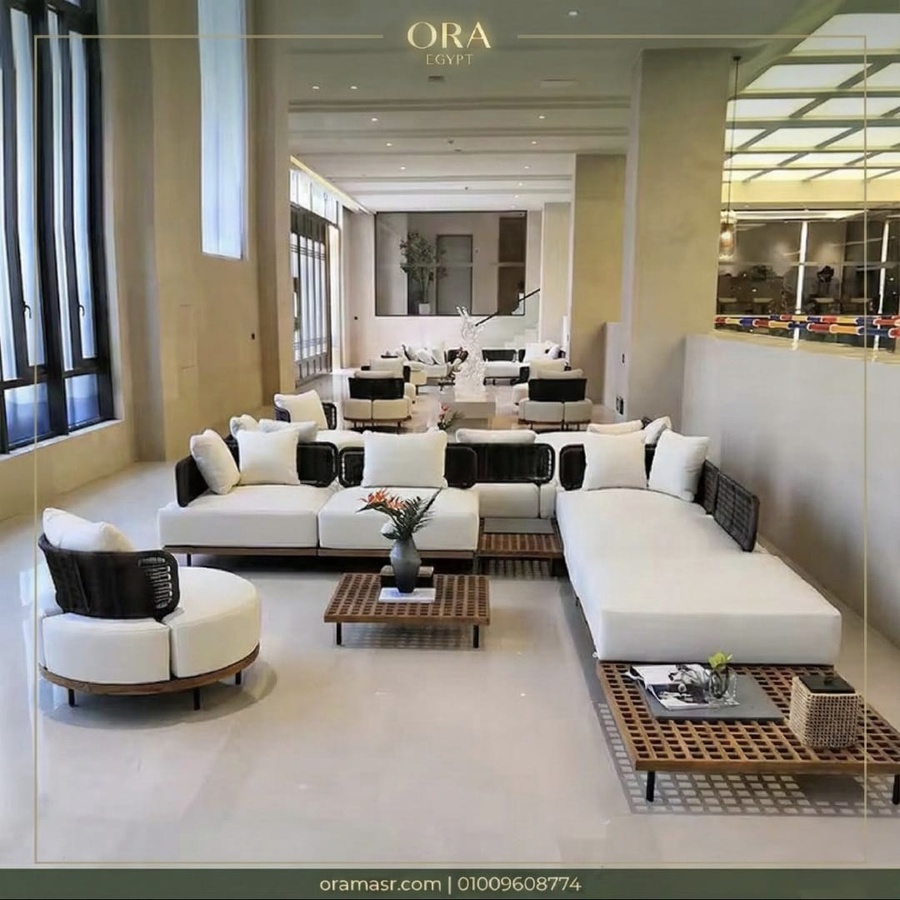 طقم ركنة خارجي: كرسي، كنبة 5 مقاعد، كنبة 3 مقاعد، ترابيزه وبفين